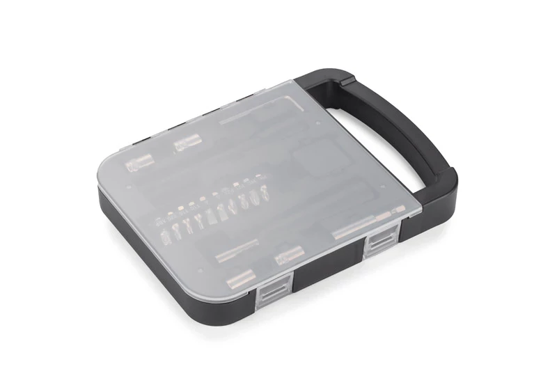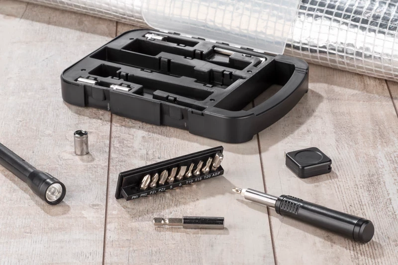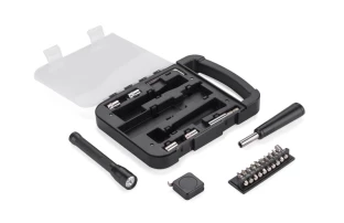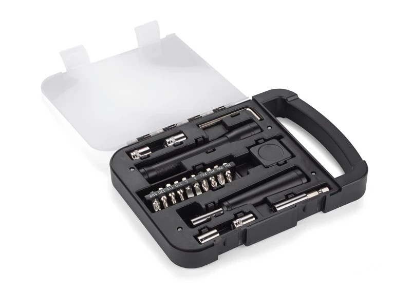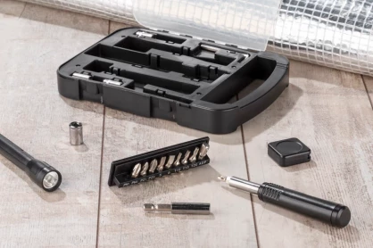 Wewnątrz znajdują się: klucz imbusowy, latarka, miara, wkrętak, dziesięć różnych bitów, przedłużka i cztery końcówki nasadowe 7mm, 8mm, 9mm i 10mm.